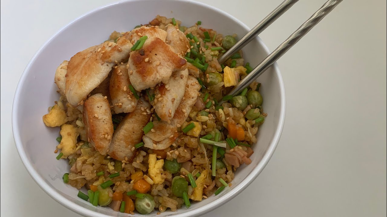 Arroz frito de verduras y pollo.