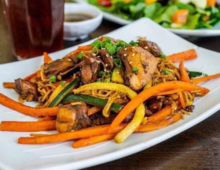 Pasta, pollo y verduras ralladas sazonadas con salsa agridulce.