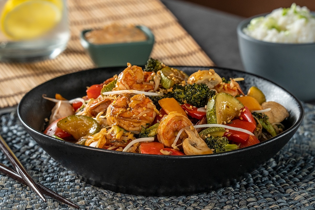 Camarón y verduras a la plancha con arroz frito y germinado de soya.