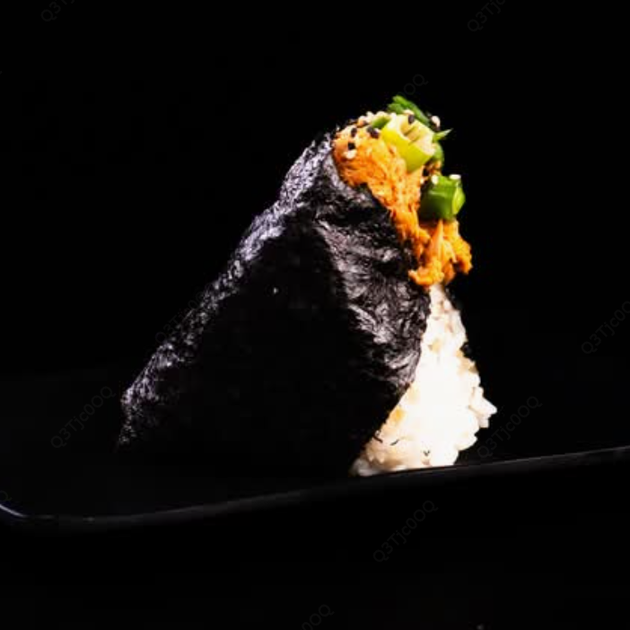 Bola de arroz triangular rellena de camarón marinado en mayonesa picante a base de salsa sriracha y aceite de ajonjolí tostado,con cebollín, envuelto totalmente en alga nori.