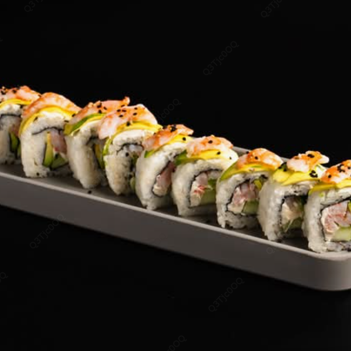 Rollo de arroz japonés con alga nori la llena de philadelphia pepino aguacate y camarón, por fuera cubierto de aguacate y ajonjolí negro.