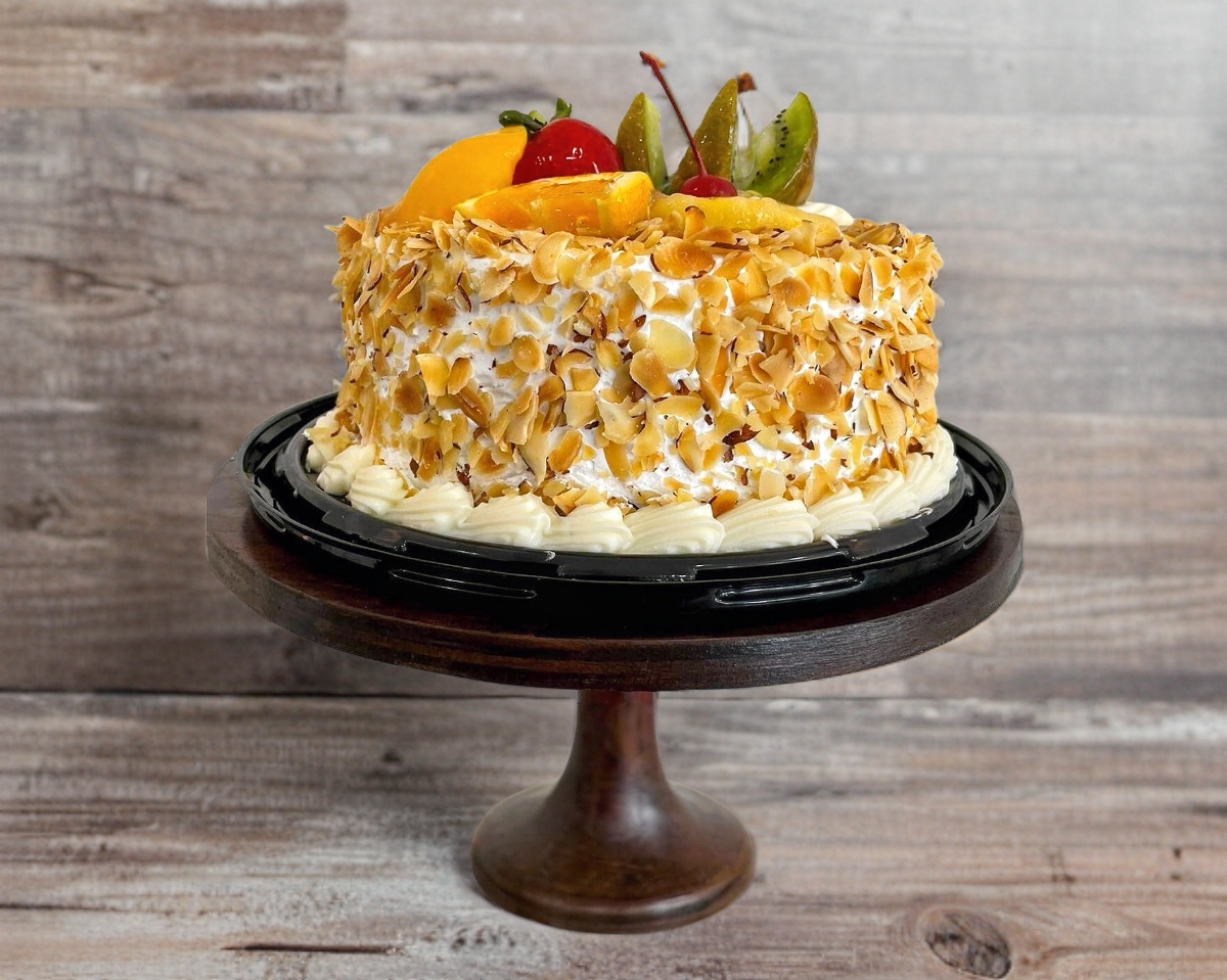 Pan de Vainilla, Relleno de jarabe de 3 leches, queso gourmet, chantilly.Cubierto con queso gourmet, almendra,Naranja,Fresa,cereza,Piña y Kiwi