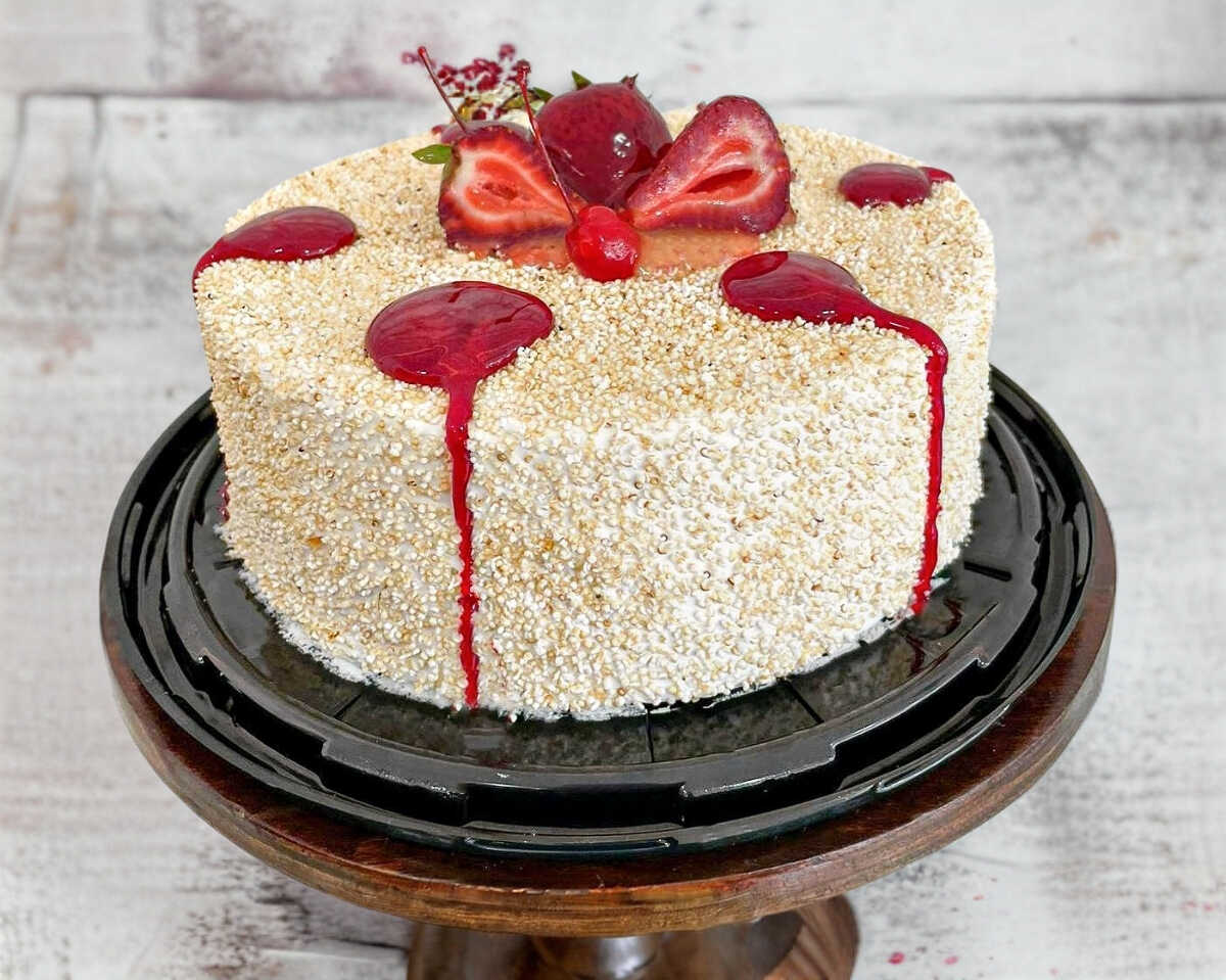 Pan de vainilla. Relleno de cheesecake, fresa y jarabe de 3 leches. Cubierto con amaranto, Fresas,Cerezas y mermelada de fresa