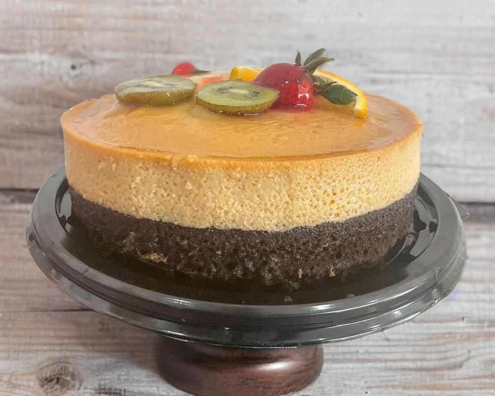 Pan Chocolate con flan casero, Decorado con fruta de temporada