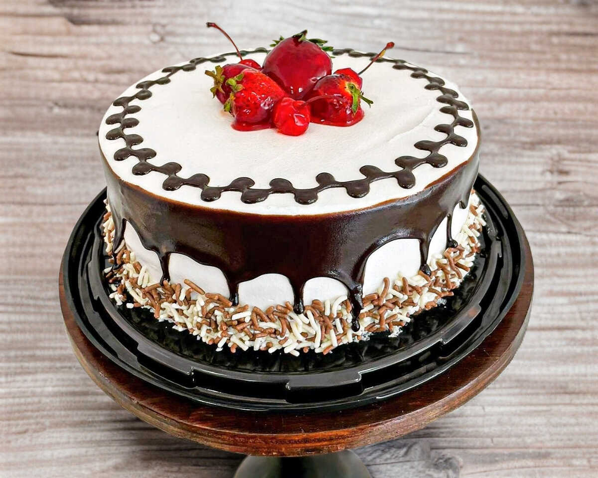 Pan de chocolate,Relleno de chesse cake, fresa y chantilly. Decorado con Ganashe, chantilly, Fresas y cerezas, Granillo de chocolate amargo