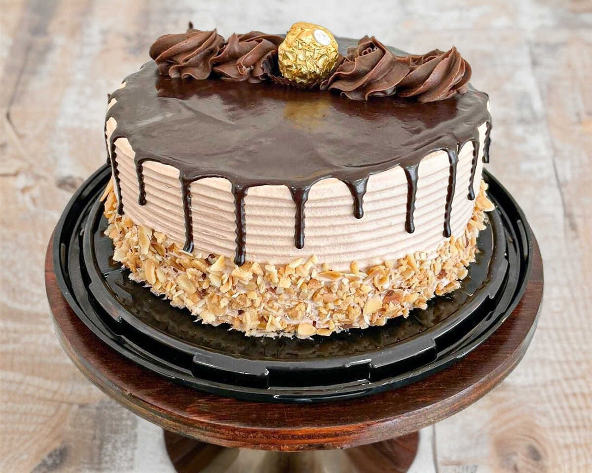 Pan de chocolate, relleno de crema de nutella, cubierto de chocolate y crema de nutella, decorado con cono y almendras tostadas