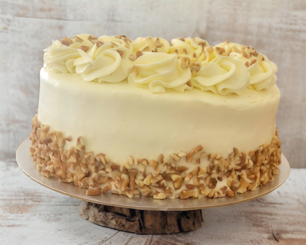 Pan de zanahoria, Relleno de queso crema, jarabe de piña,trozos de piña y nuez. Cubierto de queso crema y nuez