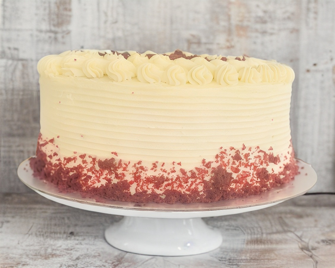 Pan red velevet, Relleno con jarabe de 3 leches y queso crema. Cubierto con queso crema, fresas naturales, cerezas y hojuelas de chocolate semi amargo
