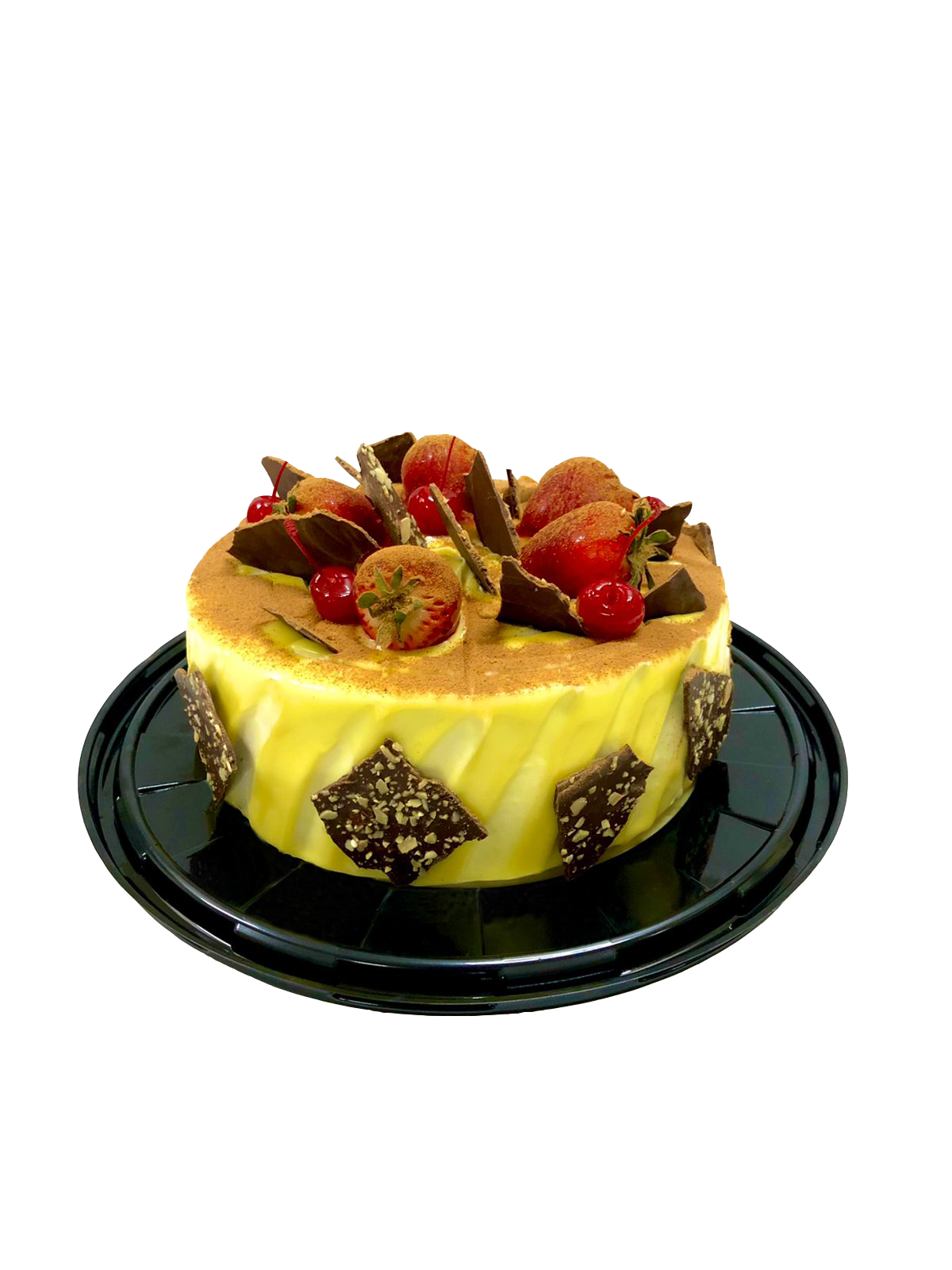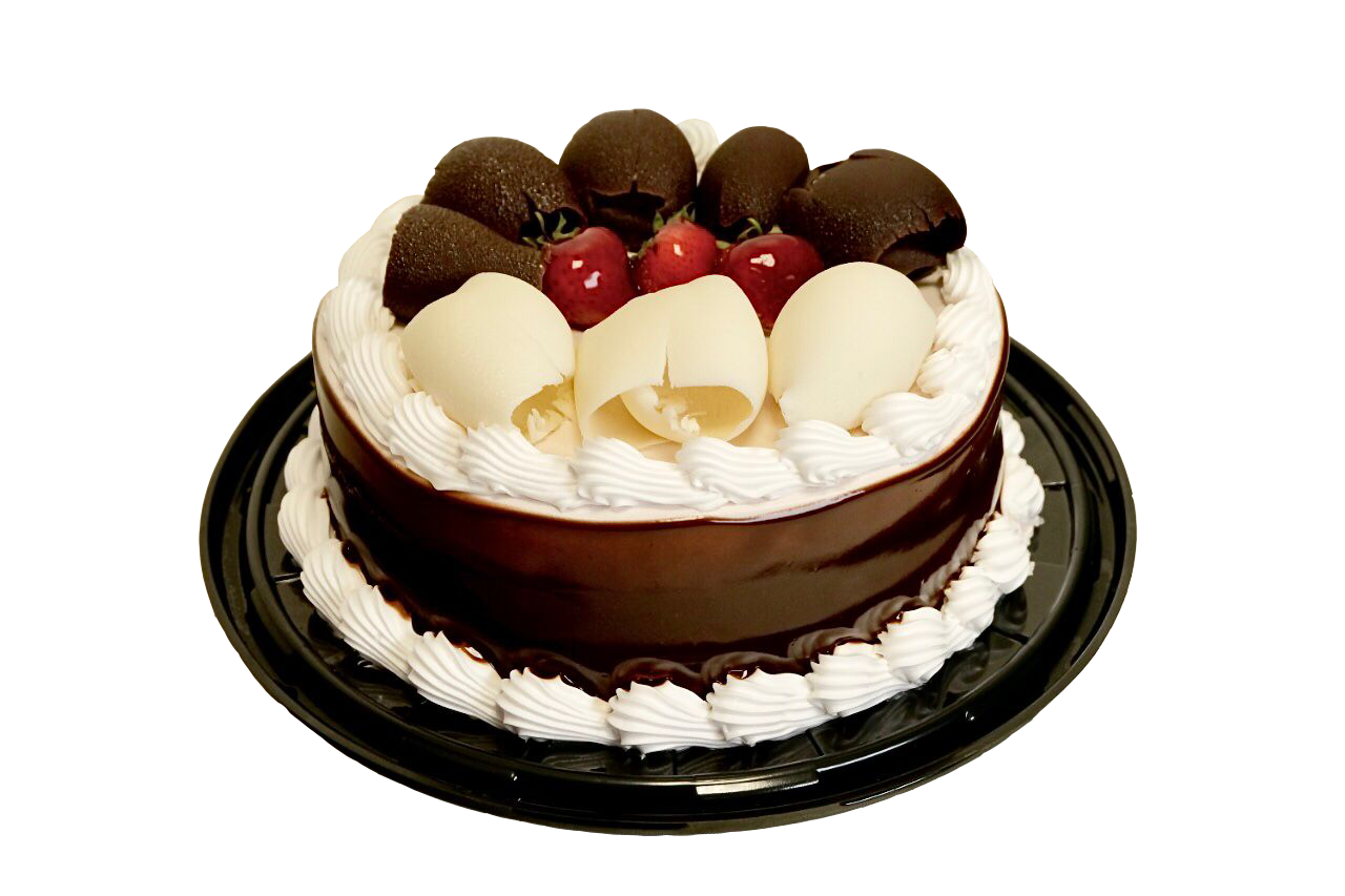 Pan de 3 leches, relleno de mousse de fresa, cubierto de crema de chocolate, con fresas y cerezas.
