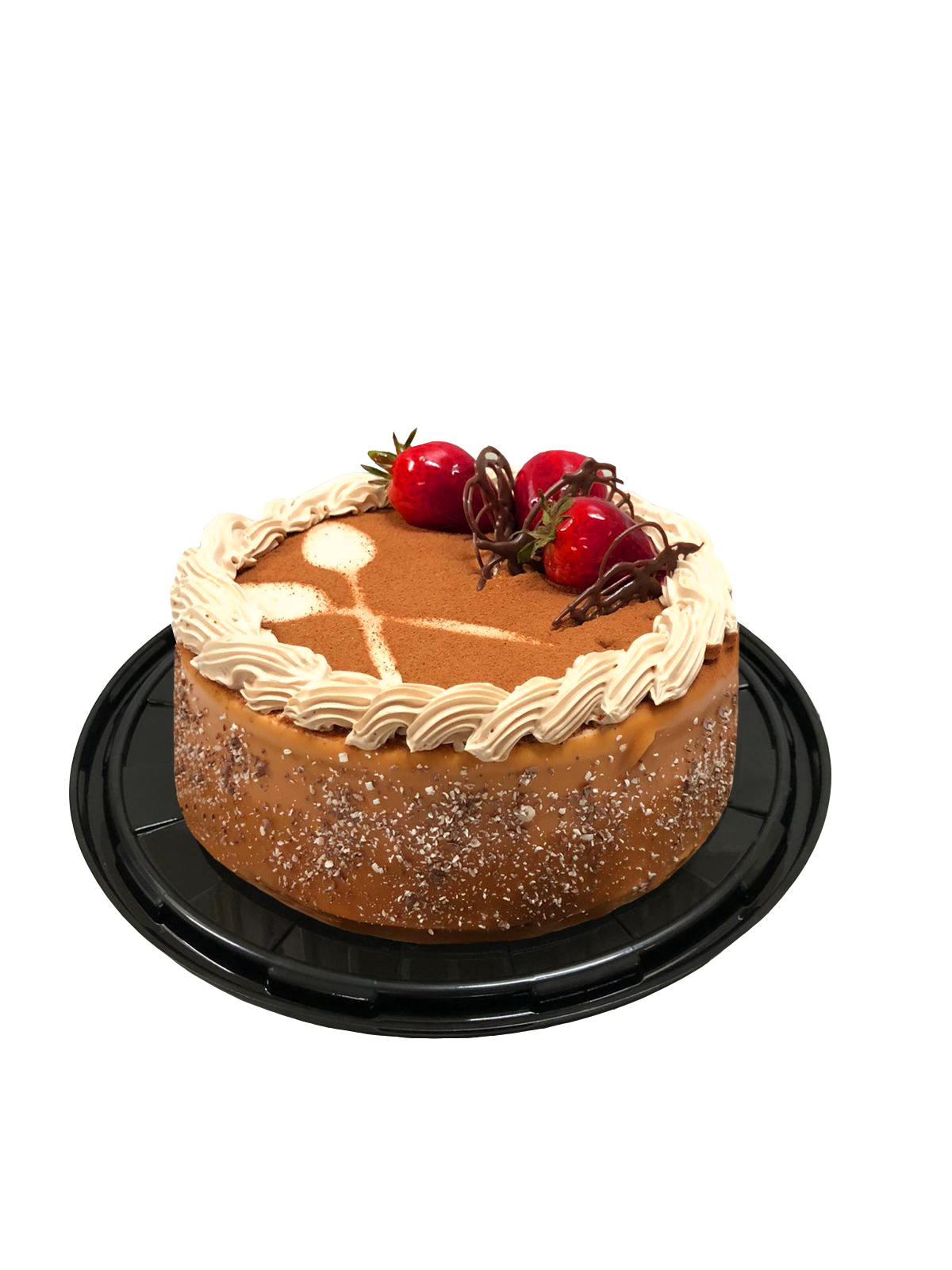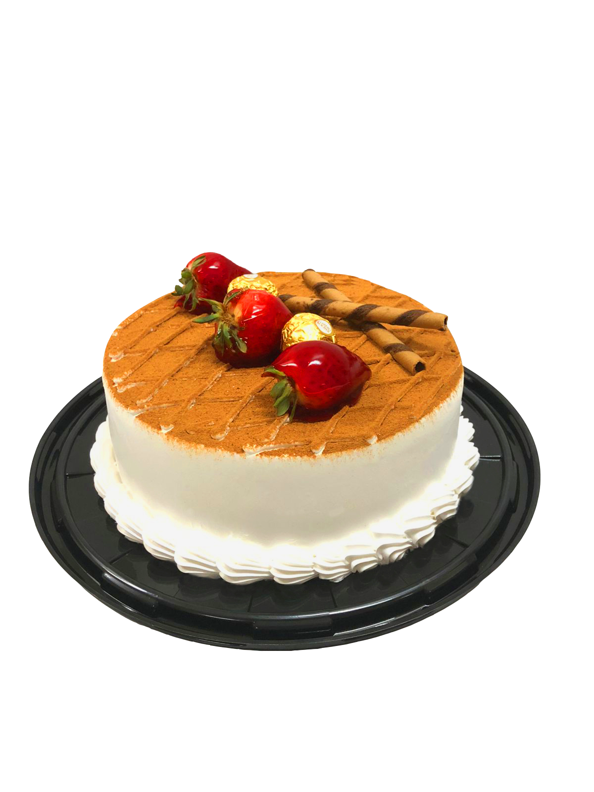 Pan de chocolate con relleno de queso sabor moka, decorado con ralladura de chocolate, fresa y Ferrero Rocher.