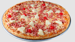 Base de salsa de tomate, queso, peperoni y mitad jamón y piña.