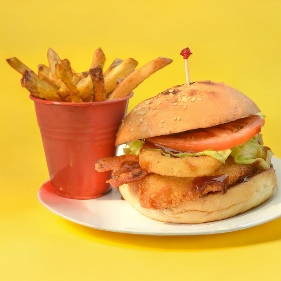 Pechuga de pollo empanizada, queso cheddar, tocino, aros de cebolla, lechuga, tomate y salsa BBQ.