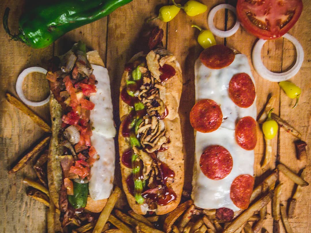Salchicha Artesanal, tocino, queso mozzarella, cebolla asada y tomate, Catsup, Mayonesa y mostaza