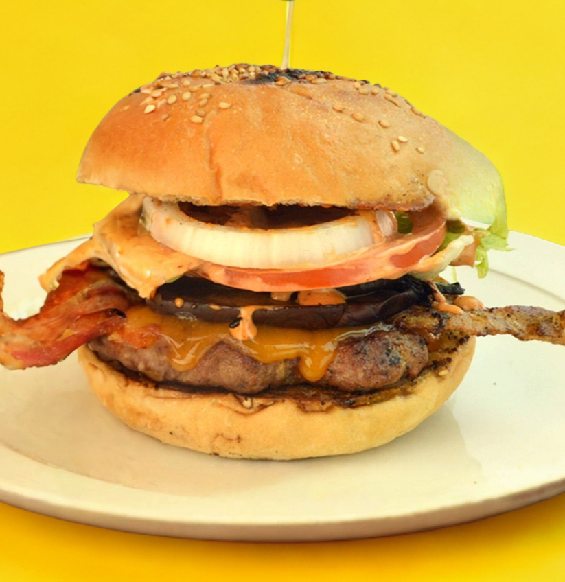 Carne, queso cheddar, portobello, tocino, lechuga, tomate, cebolla y salsa chipotle.