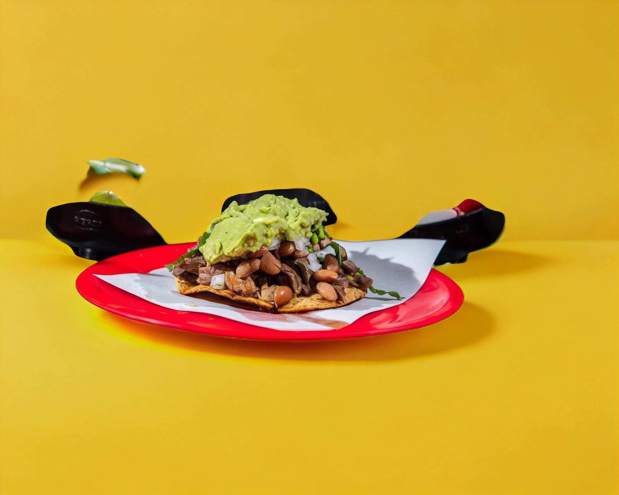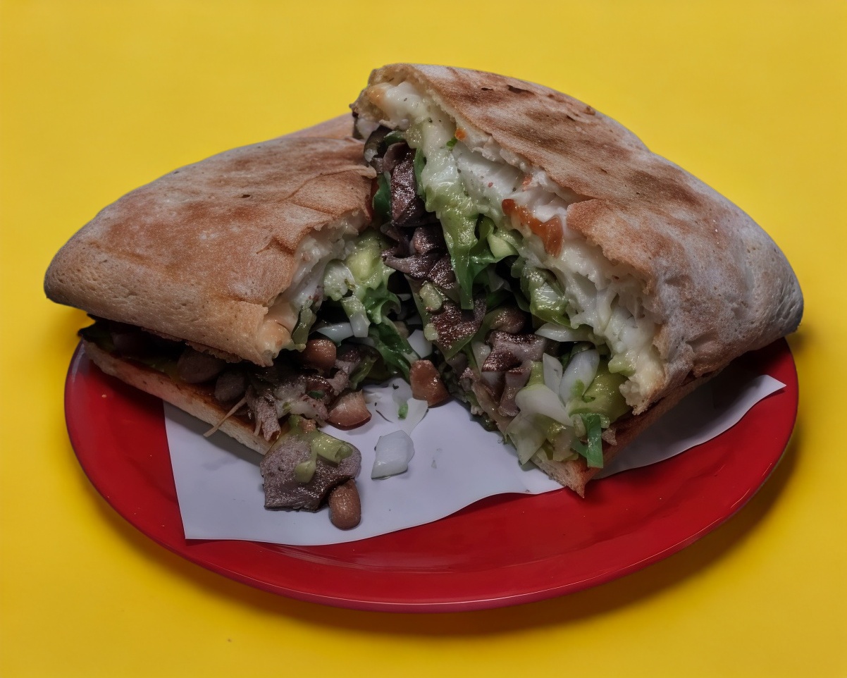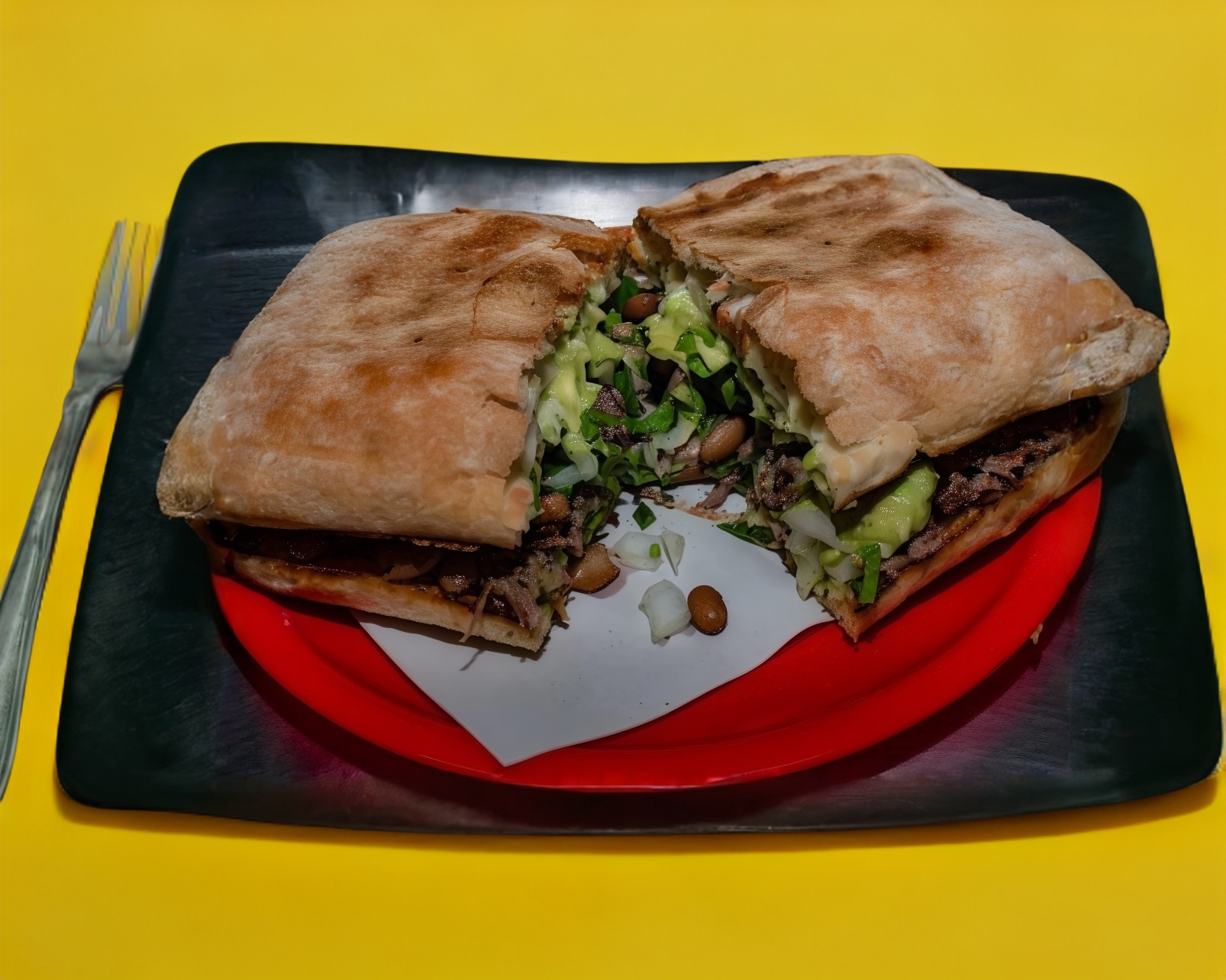 pan telera, mayonesa, carne adobada,cebolla, cilantro, aguacate.