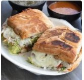 Torta rellena con aproximadamente 100 gramos de carne a elección, cebolla, cilantro, aguacate y unos 5 granitos de frijol.