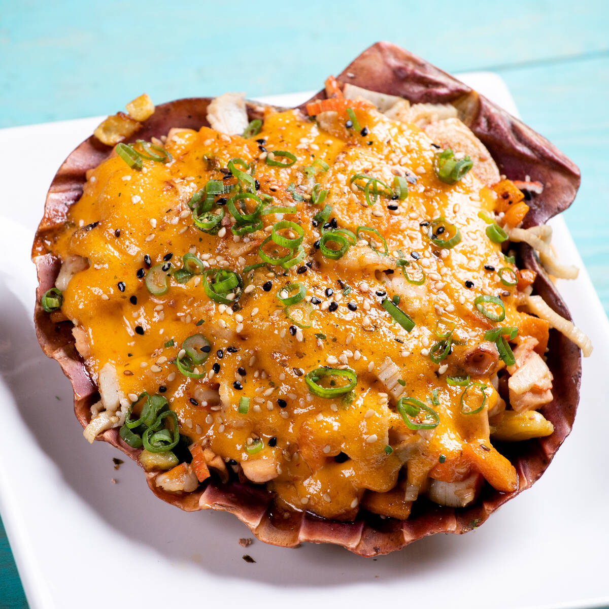 Verduras salteadas acompañada de camarón, pulpo, salmón y cangrejo servida en una concha horneada con un aderezo de la casa y especies orientales