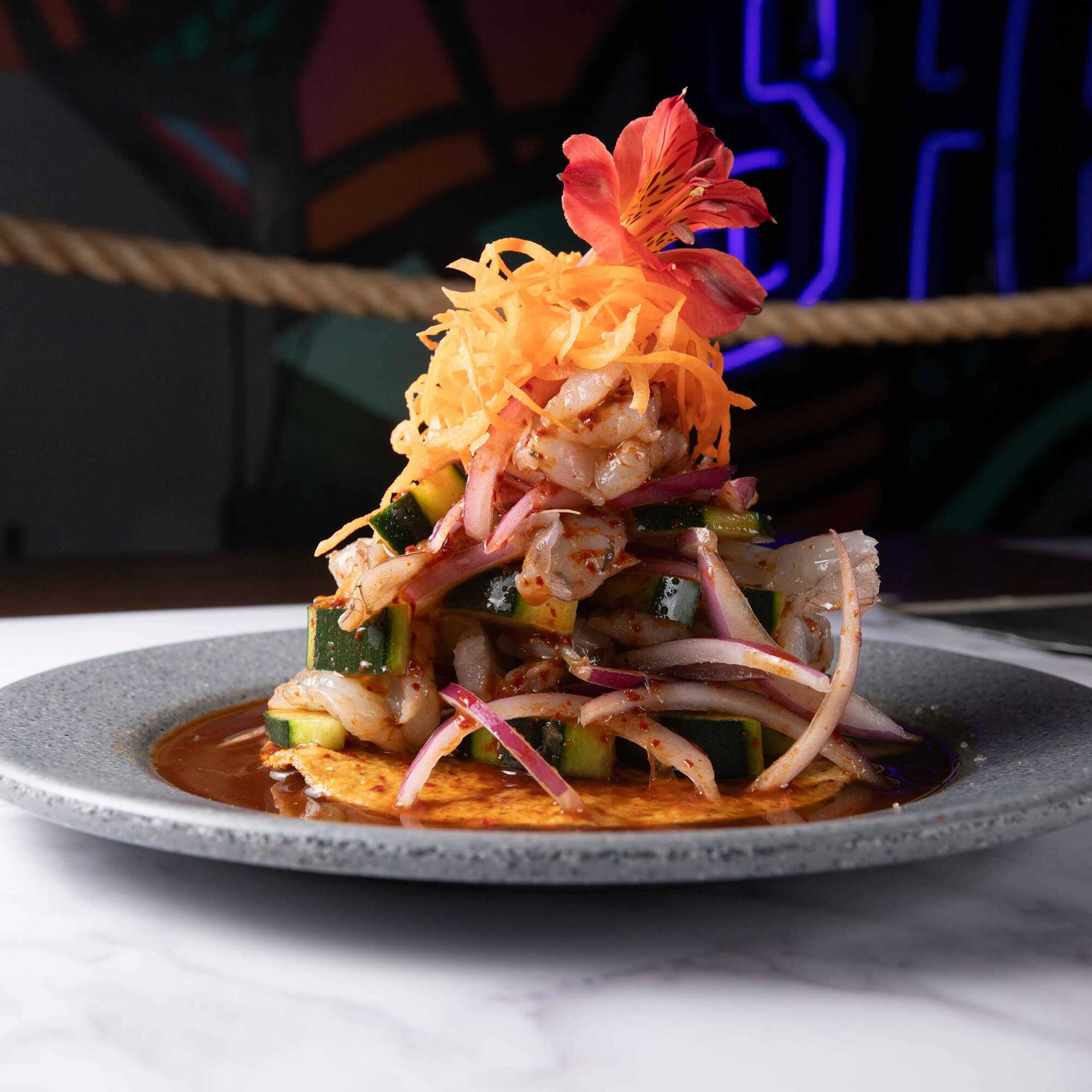 Camarón curtido en limón, corte mariposa, salpimentado, cebolla morada en juliana, pepino y salsa habanero rosa.