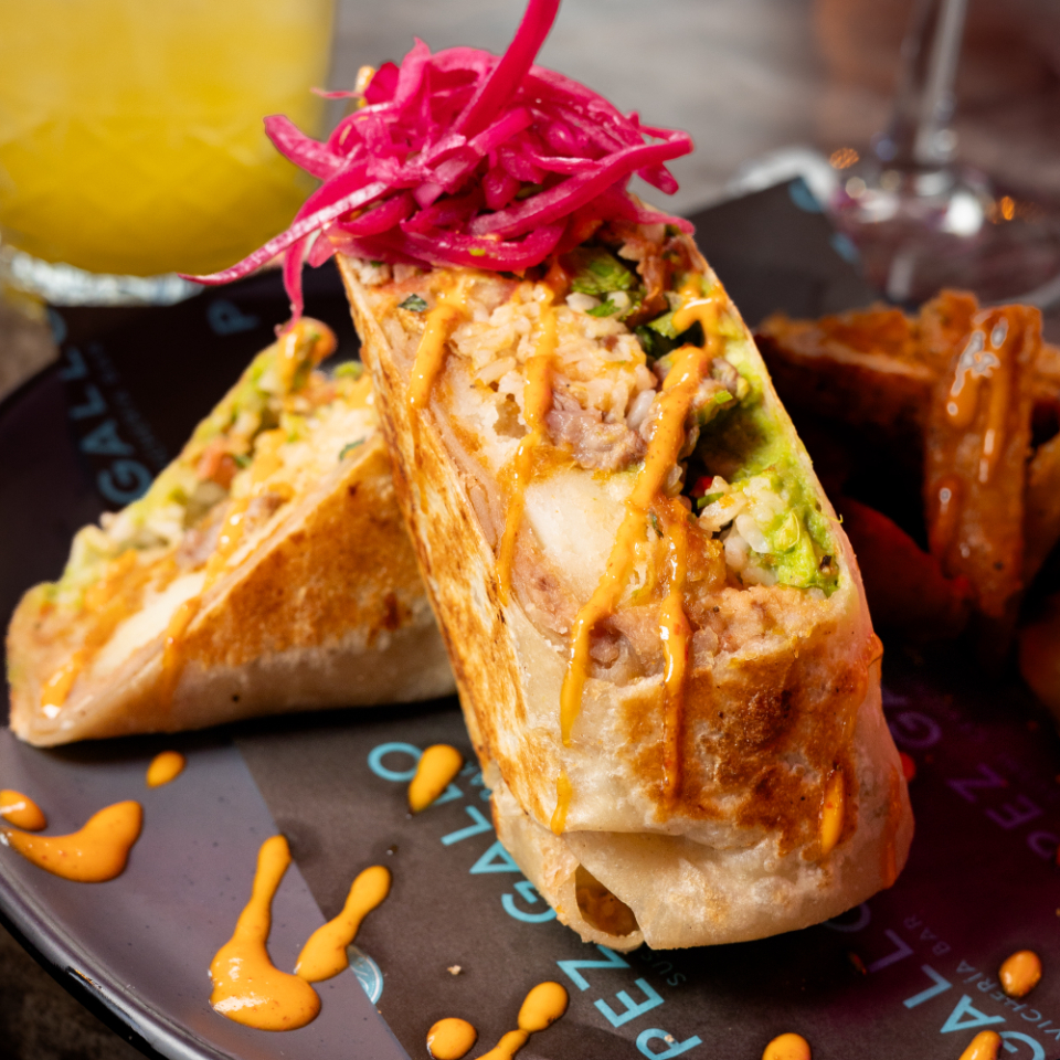 Tortilla gigante de harina con arrachera, guacamole, frijoles, arroz, papas gajo, aderezo chipotle, coronado de cebolla curtida, acompañado de papas gajo