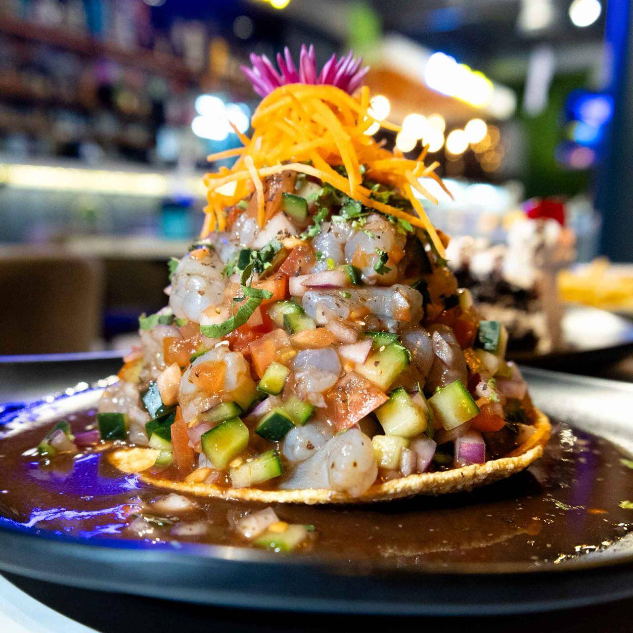 Camarón curtido en limón, camarón cocido y picado en pequeños trozos, cuadros de atún fresco, mango de temporada, cebolla morada, pepino, salpimentado, mezclado en salsa de la casa, ralladura de jícama, bañado en salsa chamoy.