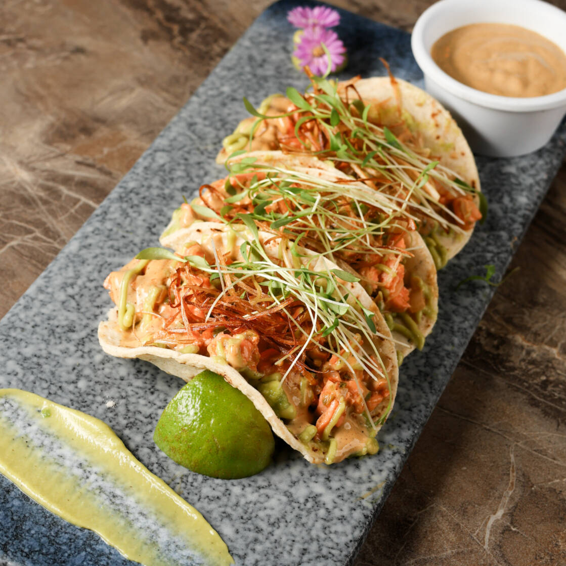 Órden de 3 taquitos de salmón adobado en costra de queso, tortilla de maíz, aderezo de chiles toreados, guacamole cremosito, poro frito, coronado con germinado de cilantro