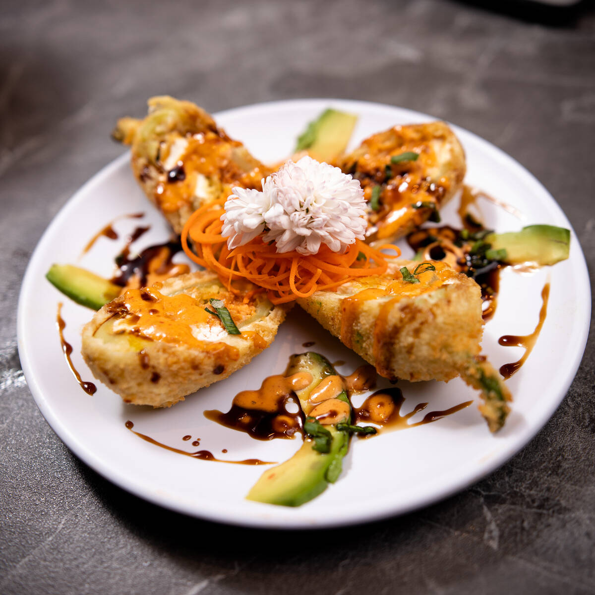 Por dentro philadelphia, aguacate, camarón, carne y por fuera queso manchego, cangrejo empanizado con un aderezo del chef y salsa especial.