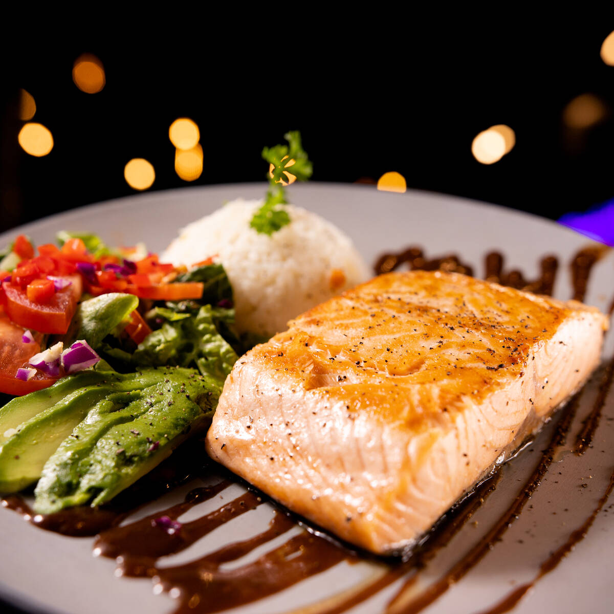 Filete de salmón a la plancha sazonado con finas hierbas acompañado de ensalada. Puré de papa o arroz