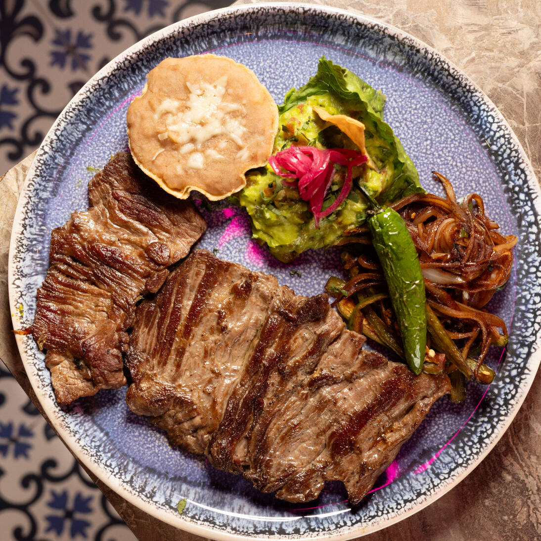 Filete de arrachera a la plancha, con guarnición de guacamole, frijoles, chile y cebolla toreados