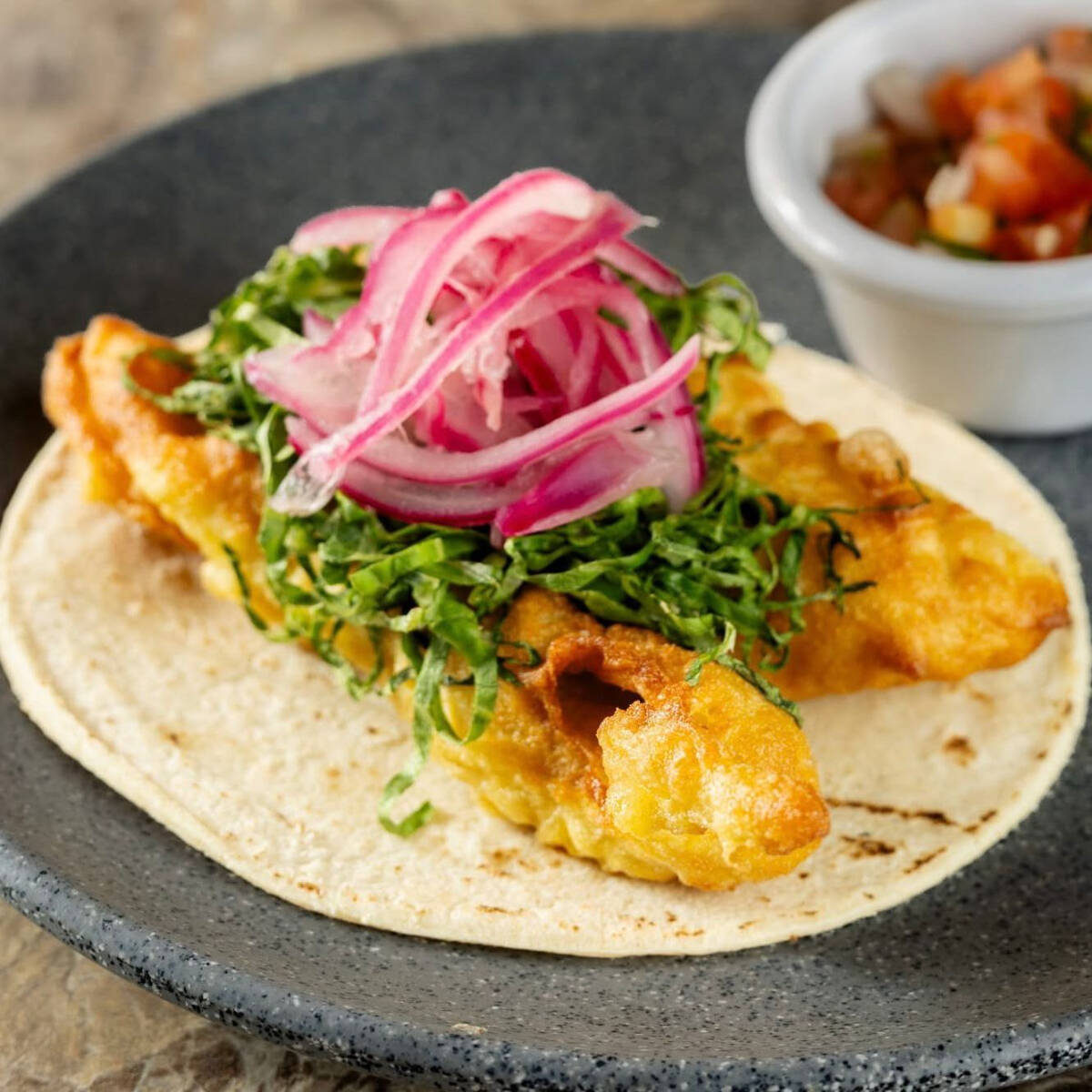 Tortilla de maíz, pescado o camarón capeado, lechuga y cebolla morada curtida