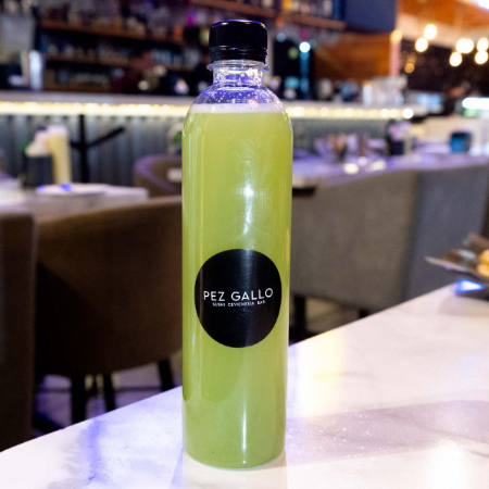 Camarón curtido en limón, corte mariposa, salpimentado, cebolla morada en juliana, pepino y salsa verde.
