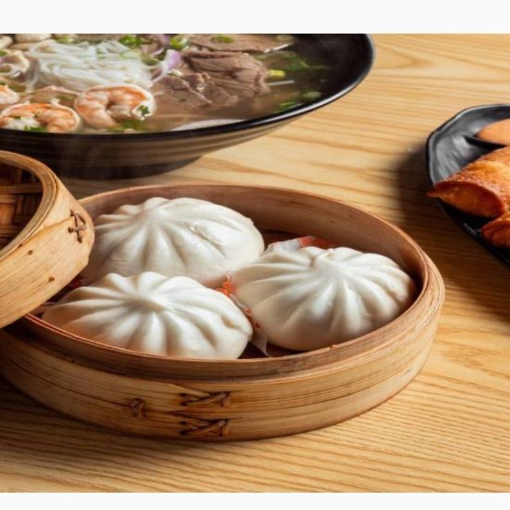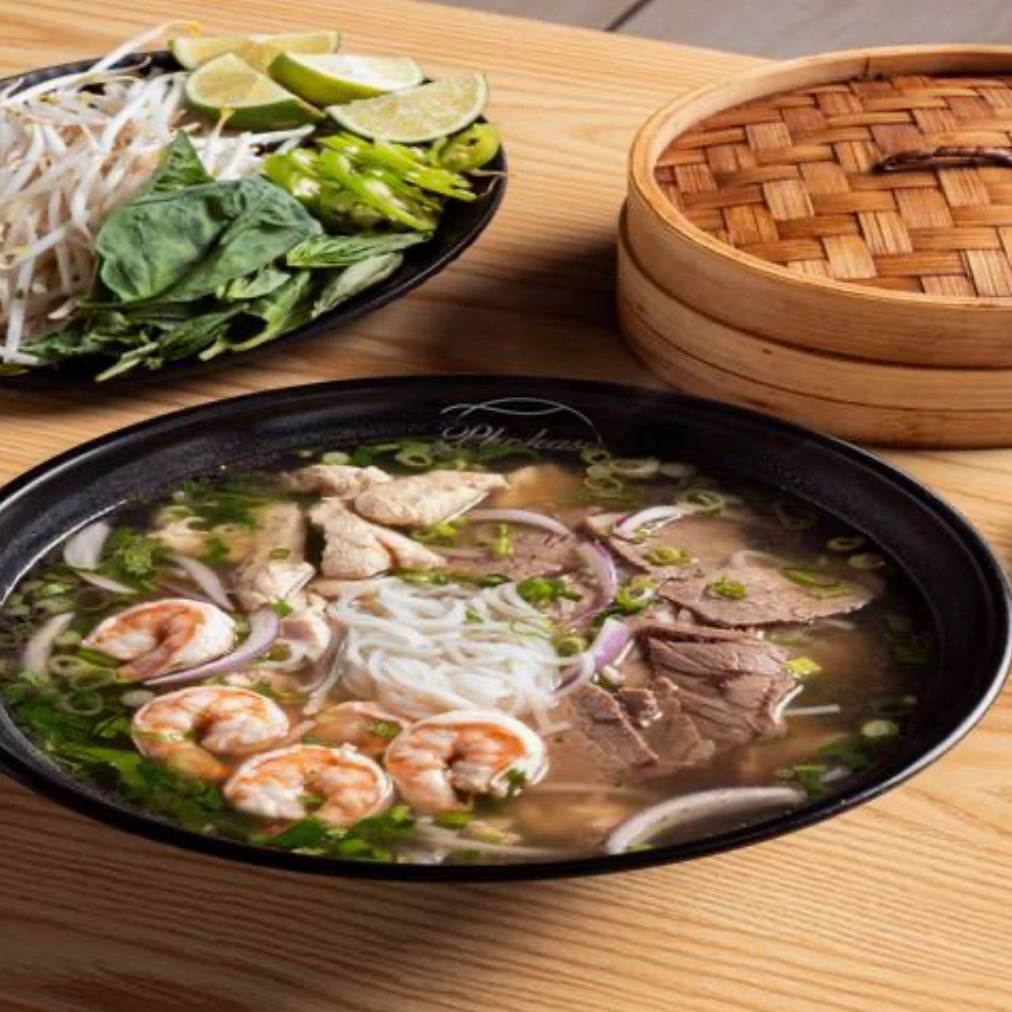 Tazón de pho con res y camarón, pollo, albóndiga de res, cebolla, cebollita, cilantro.
