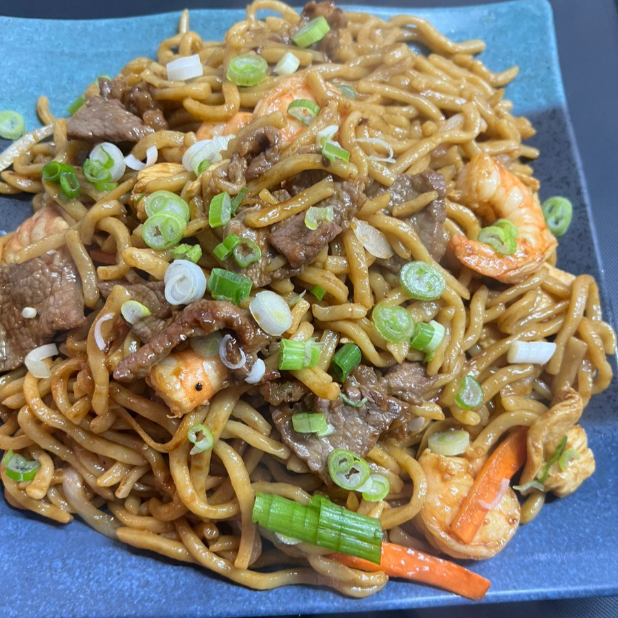Pasta gruesa, chop suey, zanahoria, cebollita, camarón, res y pollo.