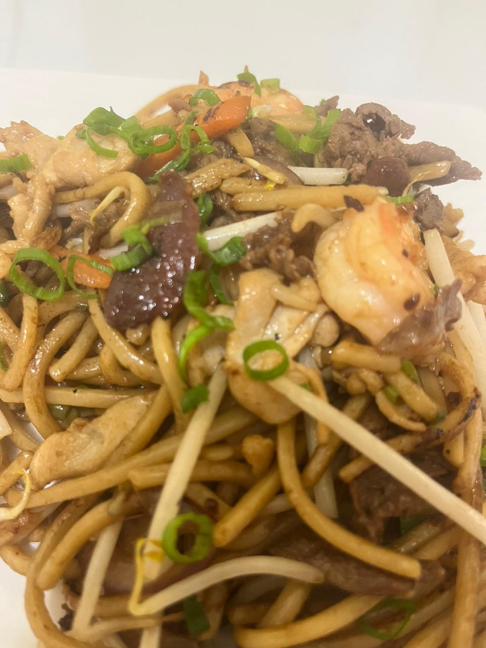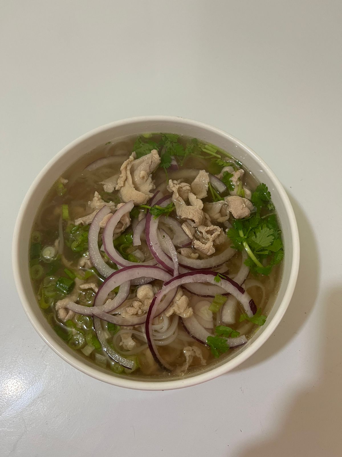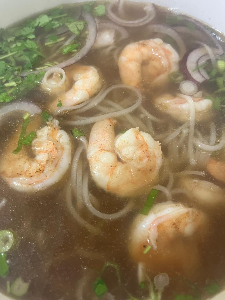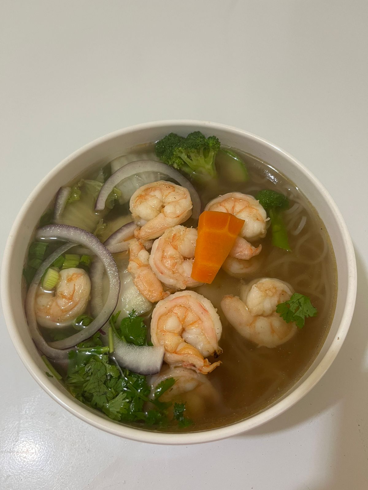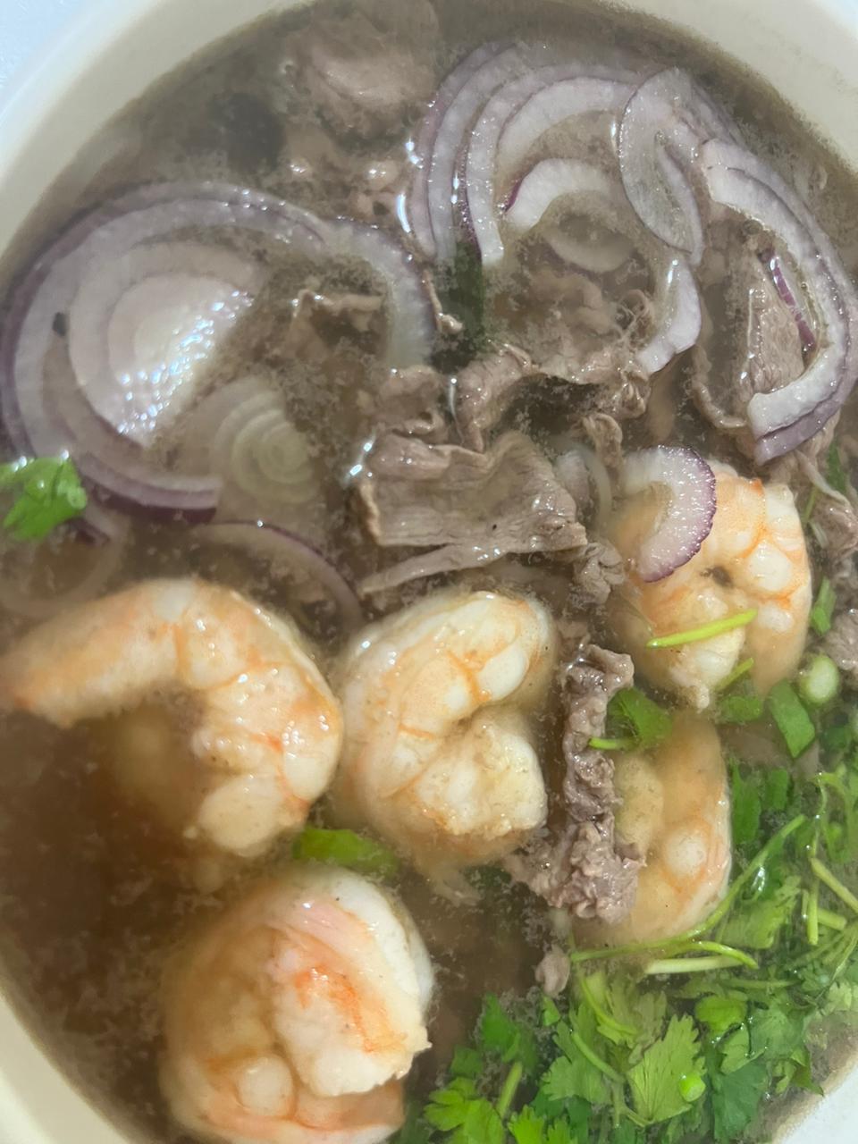 Camaròn, res, pollo, albòndigas y menudos. Acompañados de sopa, cebolla, cebollìn, cilantro y fideo.