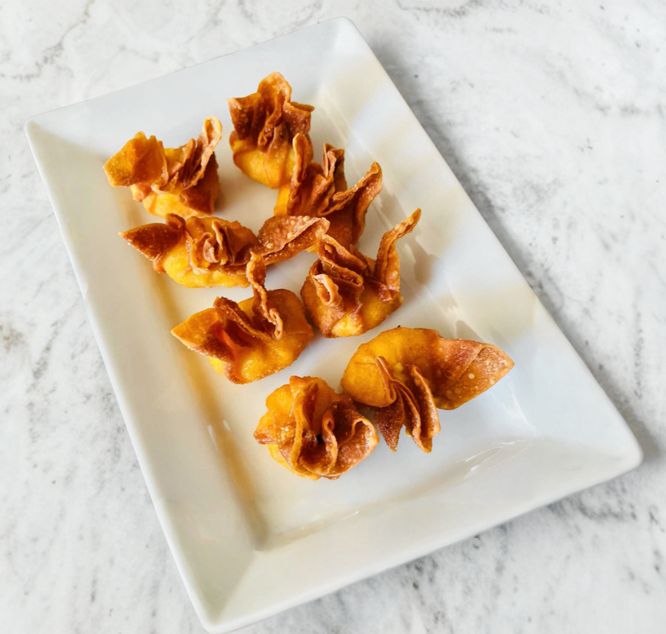 Wontons fritos rellenos de queso, zanahoria y carne de jaiba. Totalmente crujientes y muy ricos.