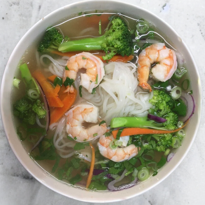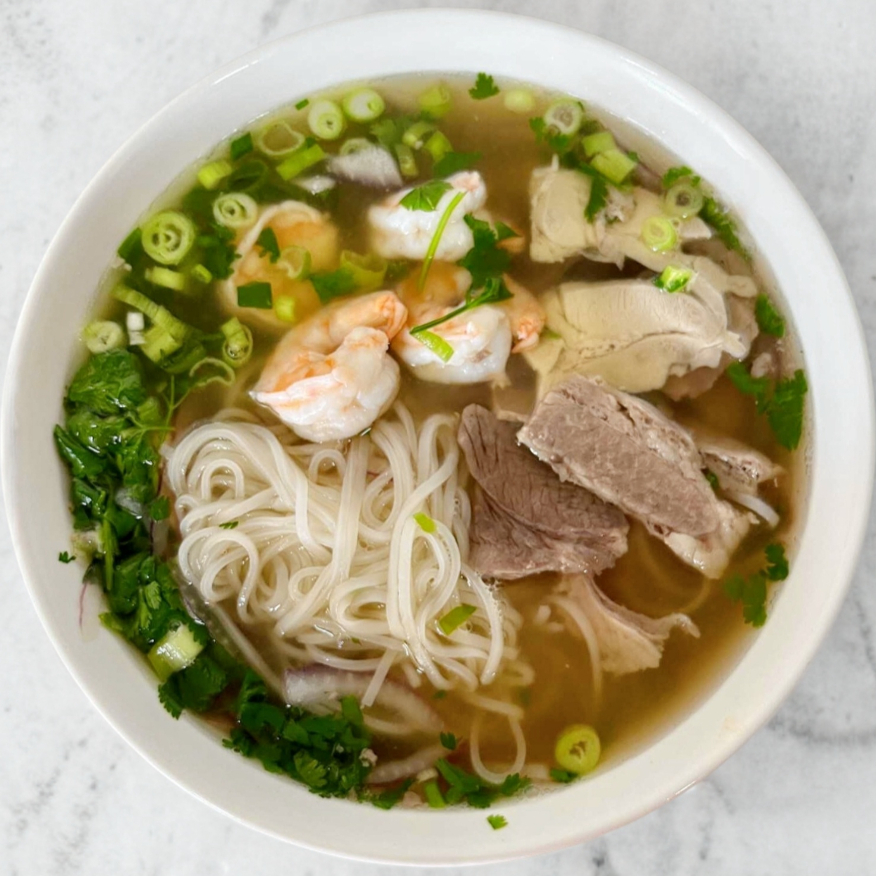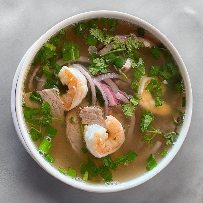 Carne de res y pollo, camarones, fideo de arroz, cebolla, cebollitas y cilantro. Tamaño Grande.