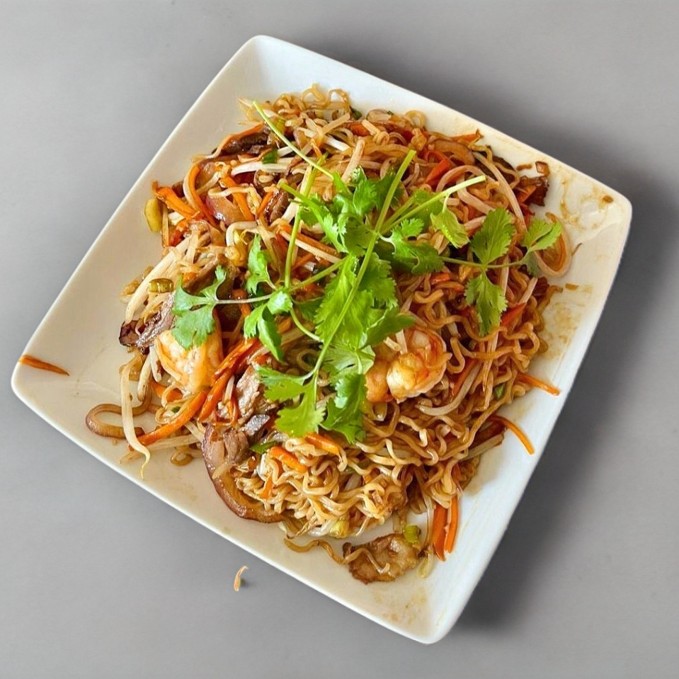 Un chow mein especial que esta preparado con verduras (zanahoria, cebolla y cebollín), carne de res y camarones, con una salsa de soya especial que le da un sabor único y delicioso.