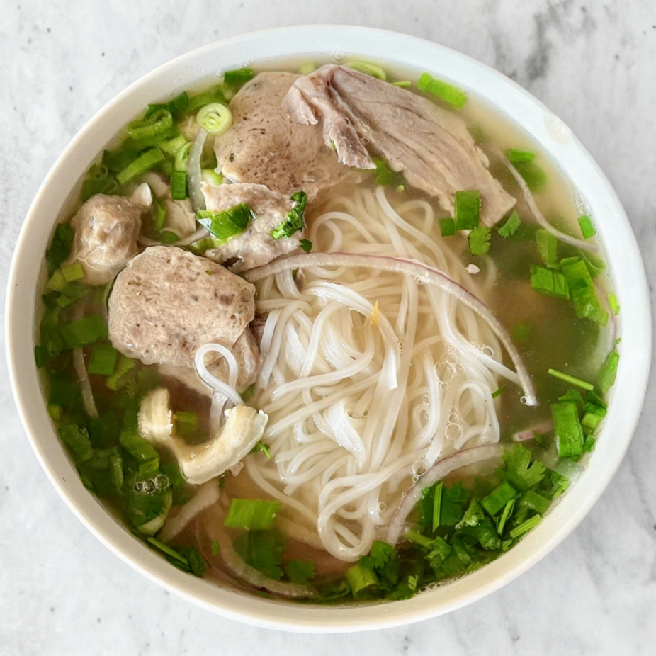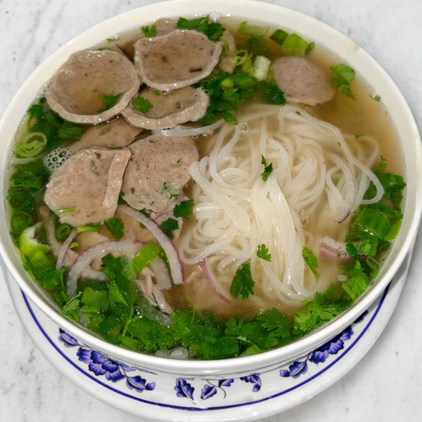 Carne de res, albóndiga de res, fideo de arroz, cebolla, cebollitas y cilantro. Tamaño Grande.