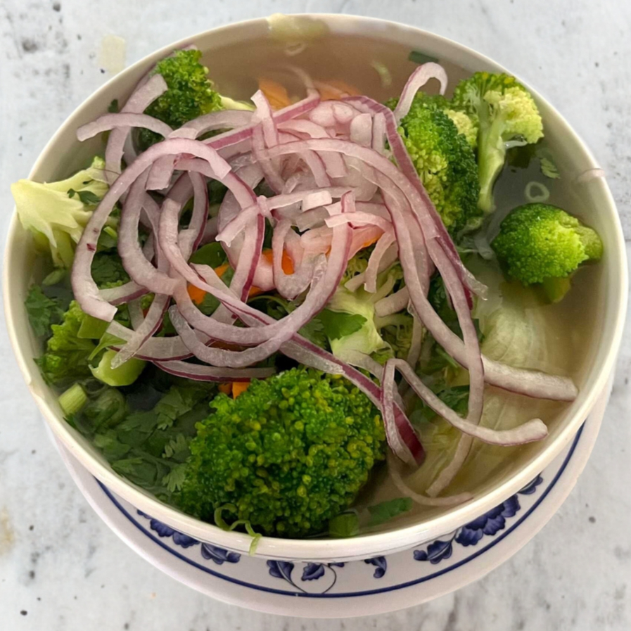 Brócoli, zanahoria, lechuga, fideo de arroz, cebolla, cebollitas y cilantro. Tamaño Grande.
