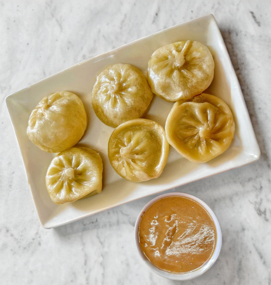 Ricos dumplings a vapor, rellenos de carne de pollo. Se acompaña con la salsa de cacahuate, que es preparado en casa.
