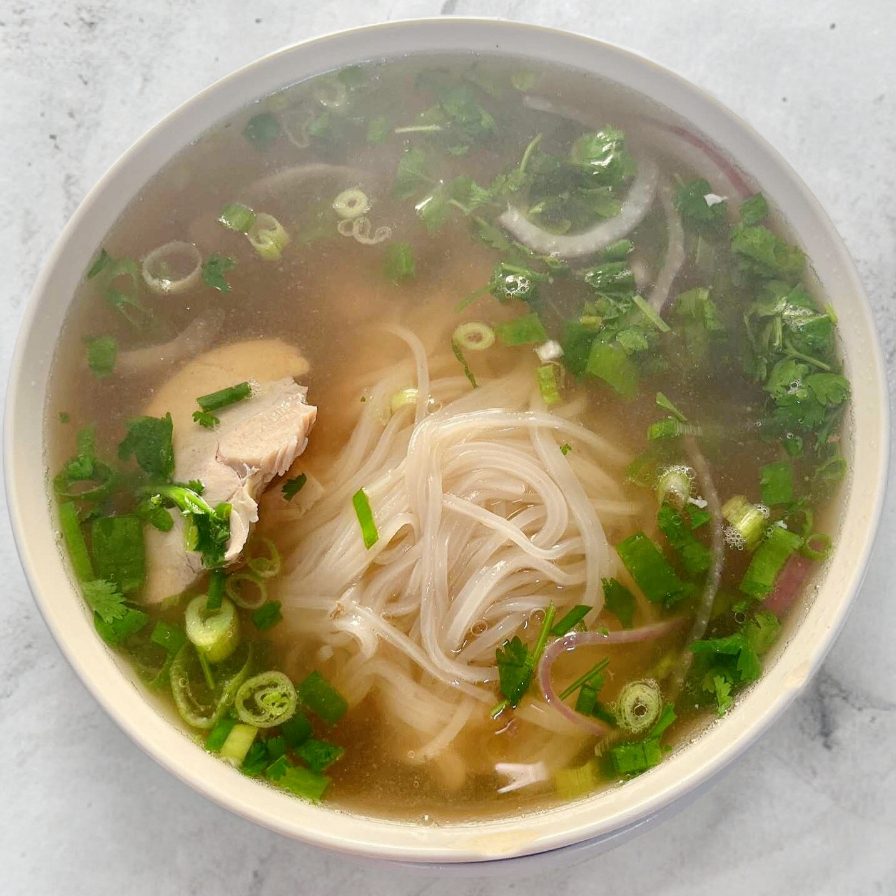 Carne de pollo, fideo de arroz, cebolla, cebollitas y cilantro. Tamaño Grande.