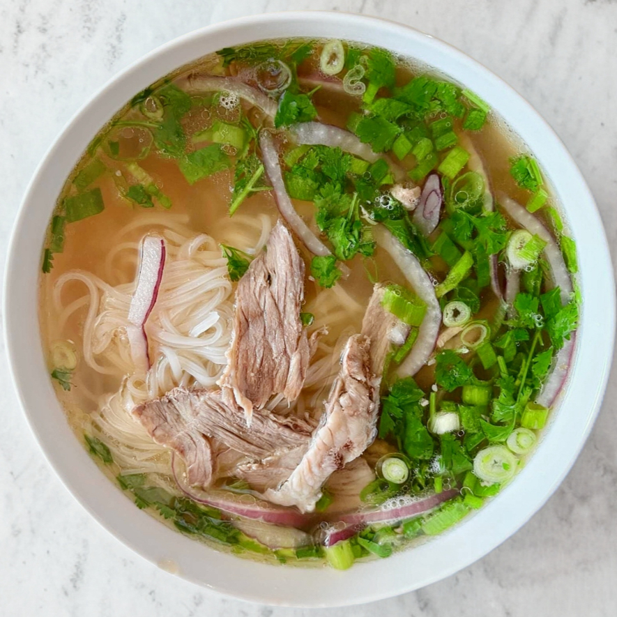 Carne de res, fideo de arroz, cebolla, cebollitas y cilantro. Tamaño Grande.