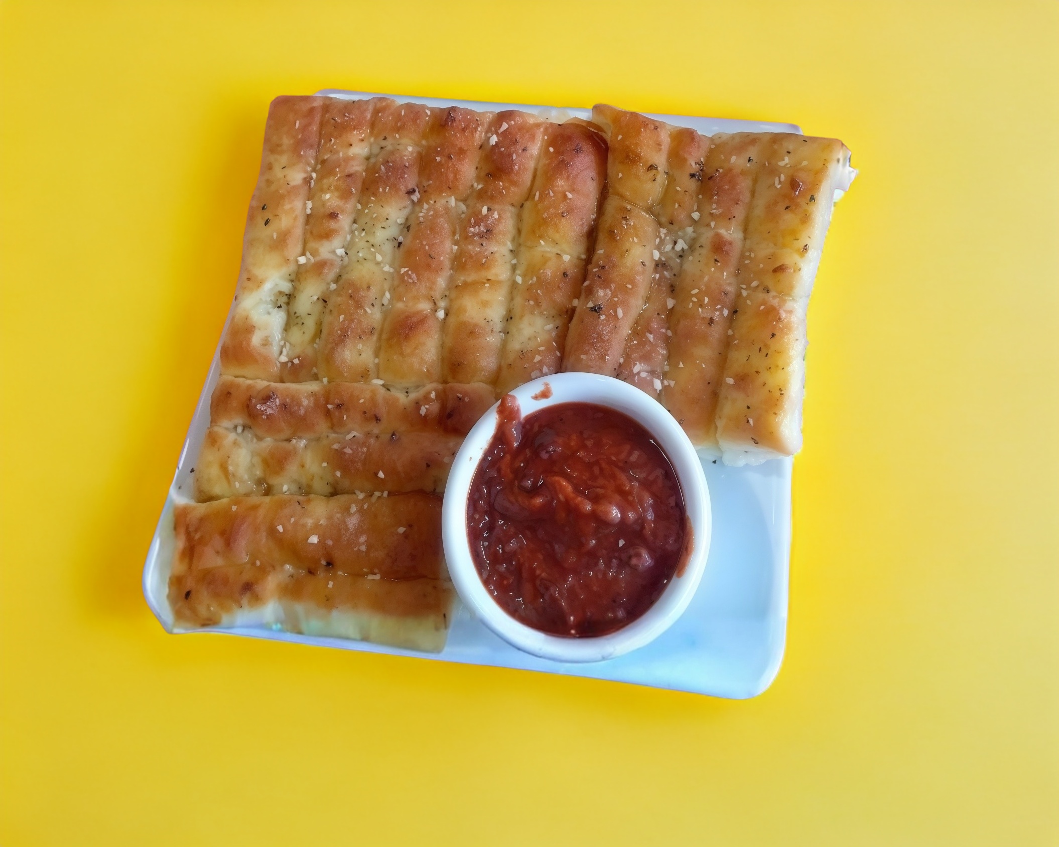 Salsa de tomate hecha en casa. Incluye una orden de pan de ajo.