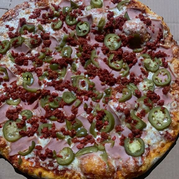 salsa de tomate con frijoles,queso mozzarella, jamón,peperoni ,jalapeño,chorizo,champiónes,piñay salchicha italia