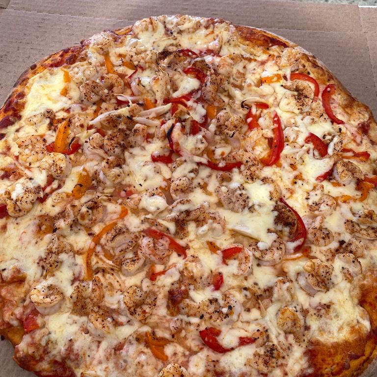 salsa de tomate, queso mozzarella, camarón, cebolla, chile morron, y chile quebrado