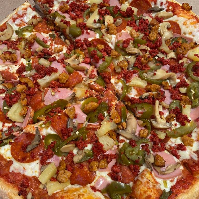 salsa tomate con frijoles,queso mozzarella, jamón, peperoni,jalapeño,chorizo,champiñones,piña y salchicha italiana