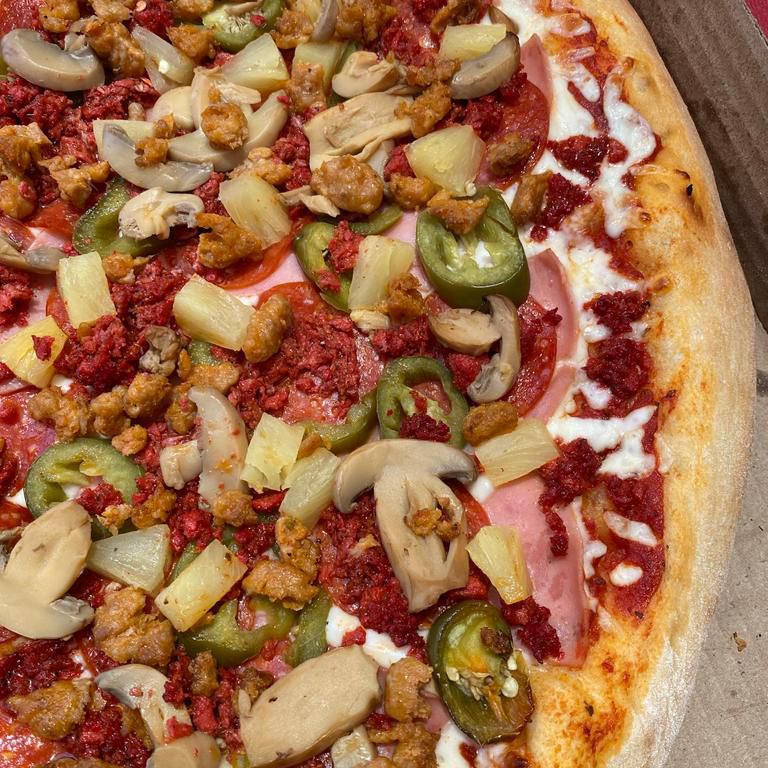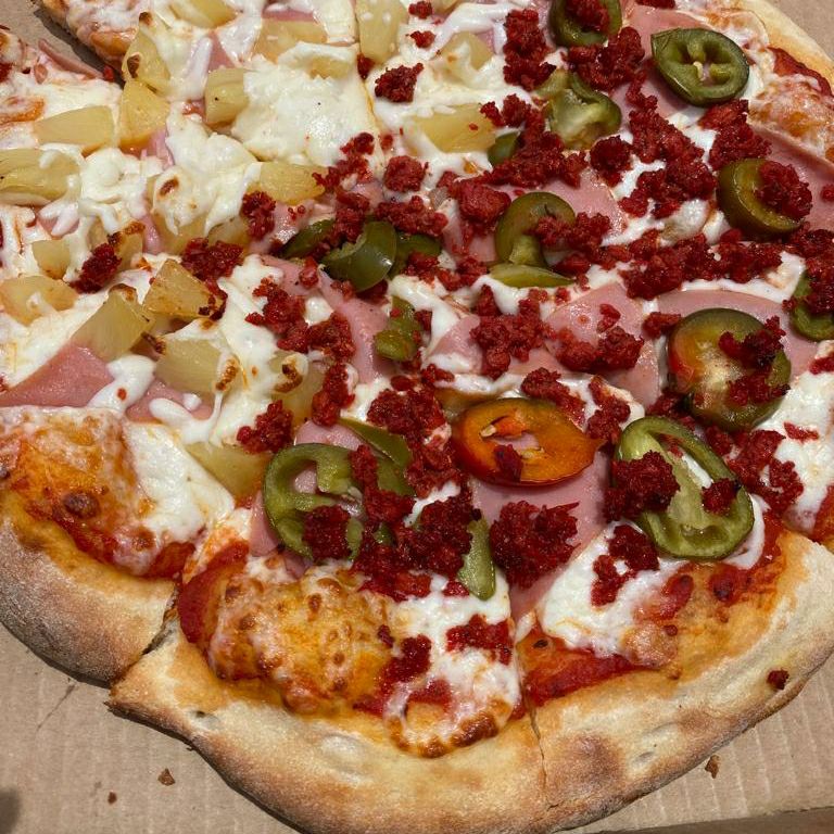 salsa de tomate, queso mozzarella ,campiñones,jalapeños, peperoni y piña