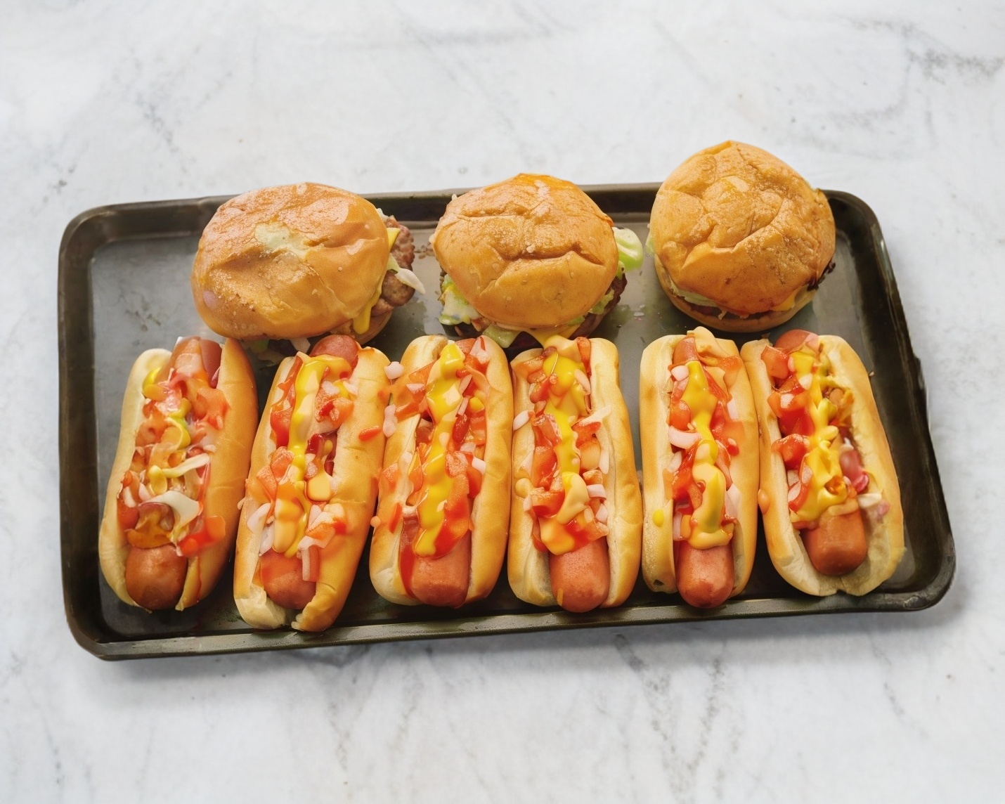 Con tomate cebolla catsup moztaza y aderezo