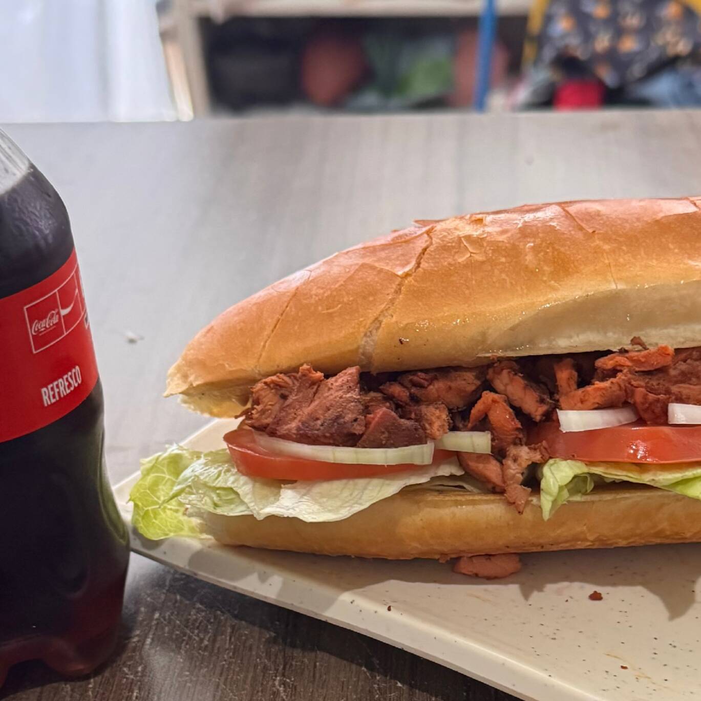 carne adobada lechuga tomate y cebolla y coca cola de 450 ml
