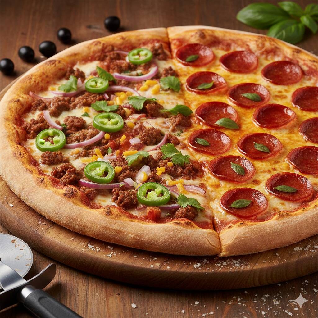 pizza con mitad base de tomate, mitad base de frijol , queso mozarella, peperoni, chorizo, cebolla y chile jalapeño