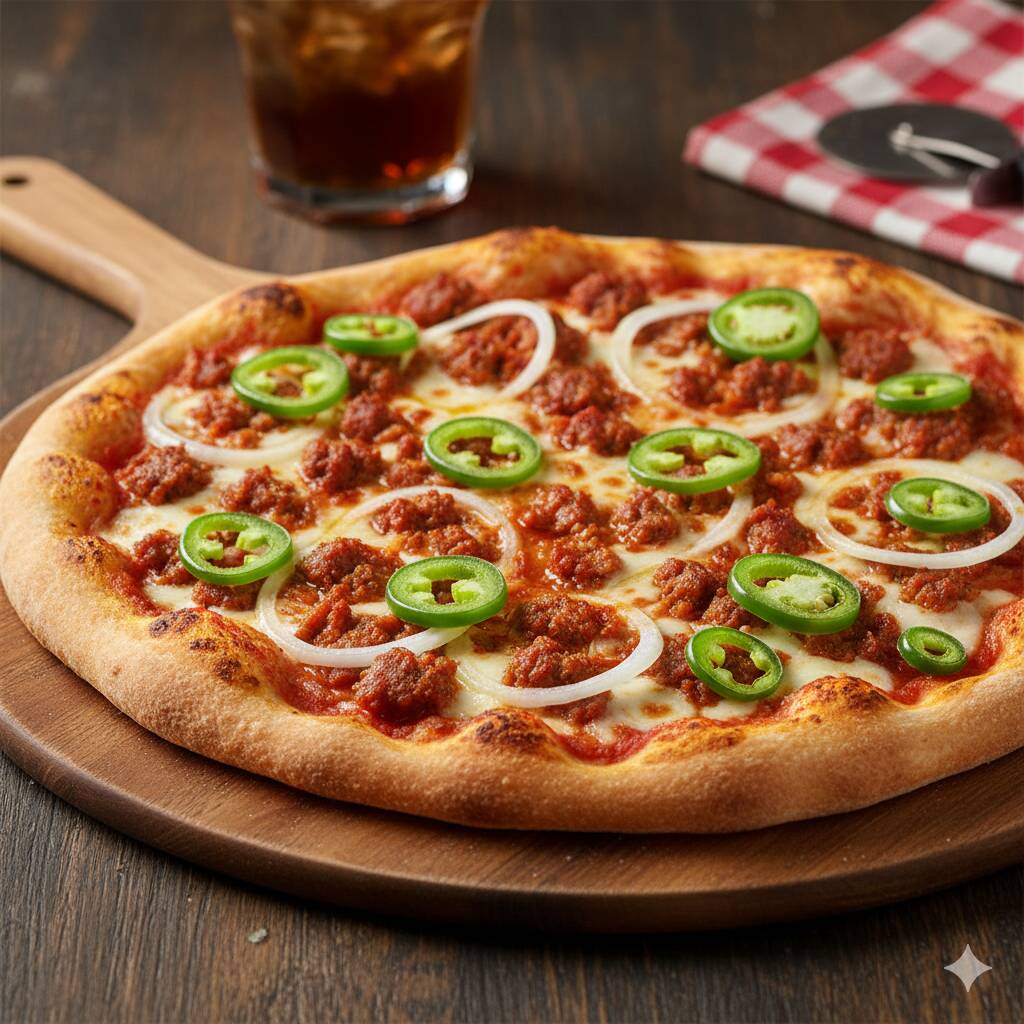 Pizza con base de frijol, queso mozzarella, chorizo, cebolla blanca y chile jalapeño.